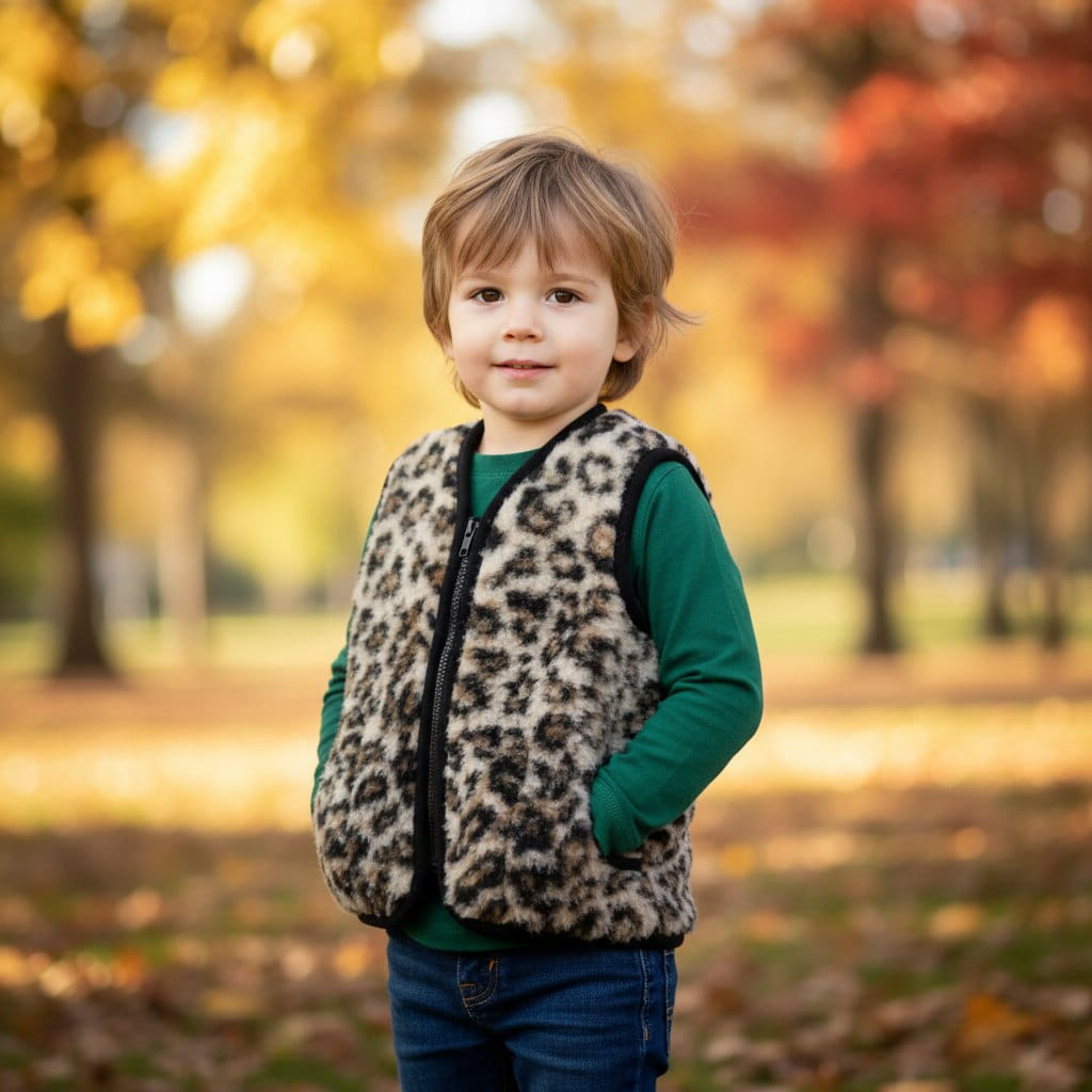 Wprowadź do garderoby swojego dziecka kamizelkę wełnianą merynos australijski o pięknym wzorze lamparta, która łączy funkcjonalność z wyjątkowym stylem! Stworzona z myślą o dzieciach w wieku 2-3 lat, jest idealnym rozwiązaniem na chłodniejsze dni.