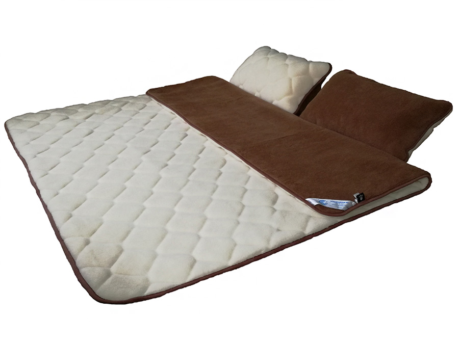 • Elementy pościeli takie jak kołdra i poduszki wykonane są z dwóch warstw dzianiny wełny camel ciemny + kaszmir caro.