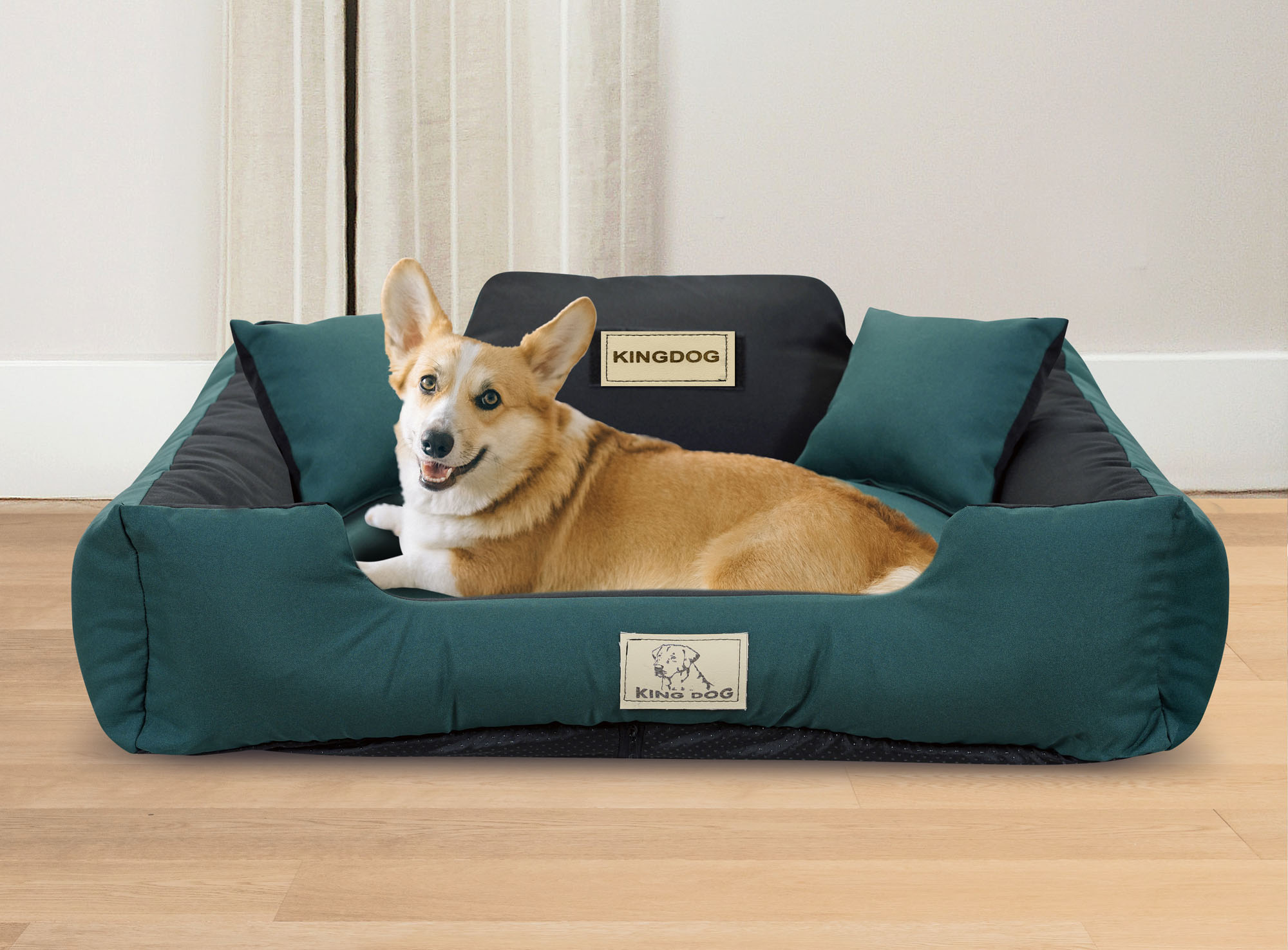 ROZBIERALNE z zamkiem, antypoślizgowe legowisko dla psa KINGDOG w kolorze zielonym, PERSONALIZOWANE imieniem pupila!