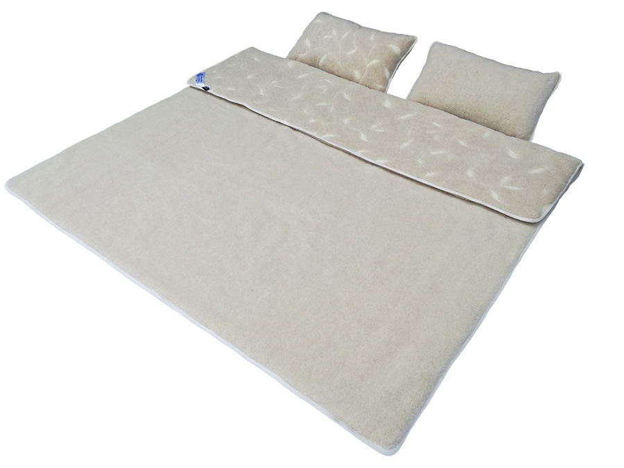 • Elementy pościeli takie jak kołdra i poduszki wykonane są z dwóch warstw dzianiny wełny jasny benjamin + camel jasny.