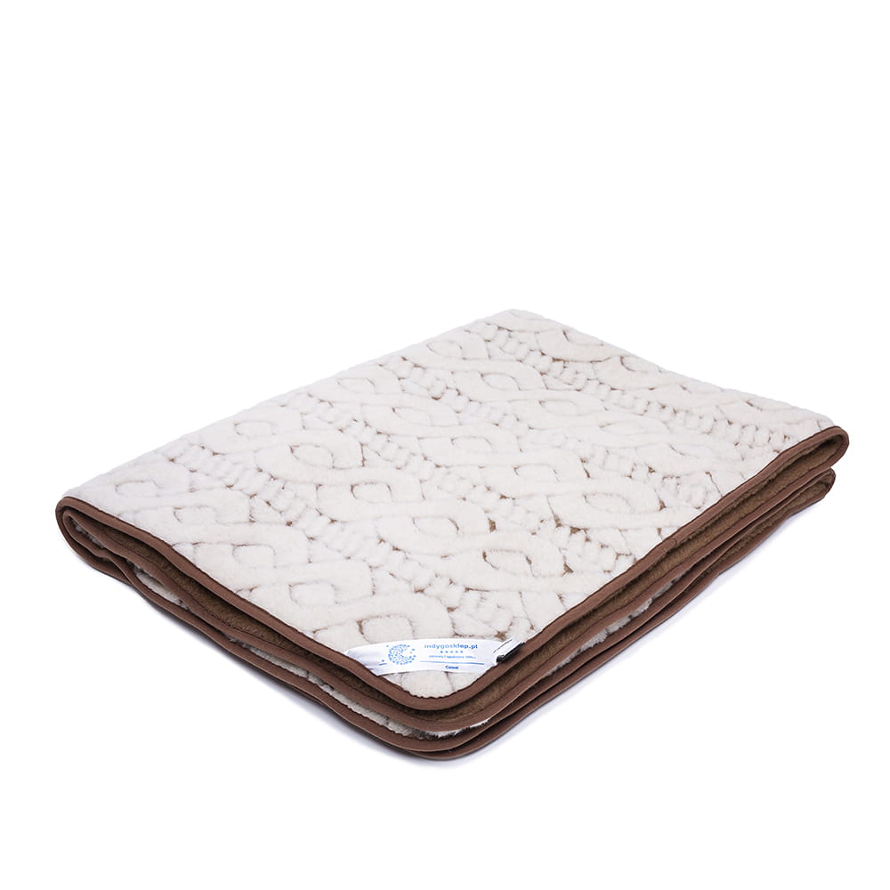 - Elementy pościeli takie jak kołdra i poduszki wykonane są z dwóch warstw dzianiny wełny jasny trentino + camel ciemny.