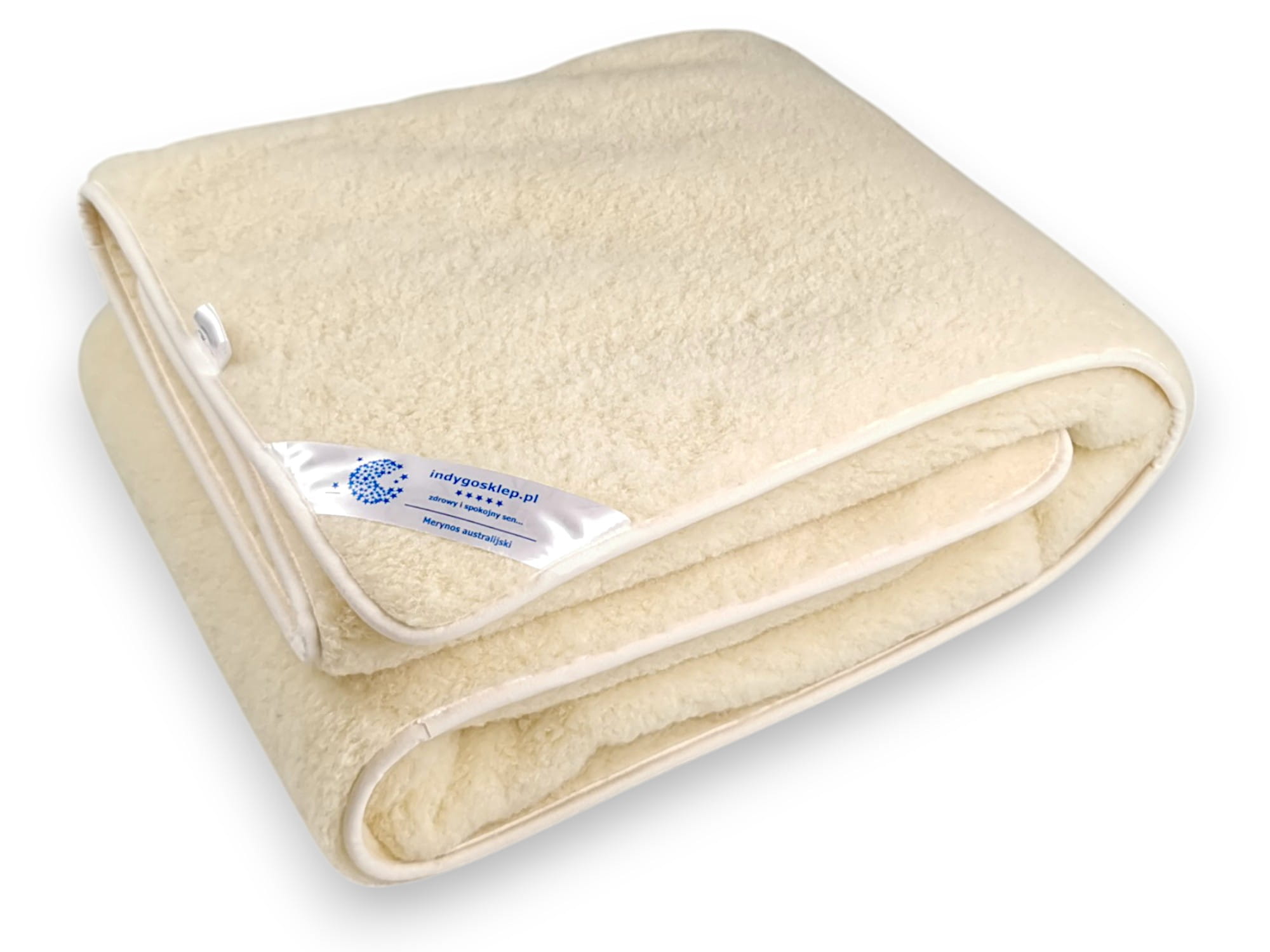 - Elementy pościeli takie jak kołdra i poduszki wykonane są z dwóch warstw dzianiny wełny merynos australijski ecru.