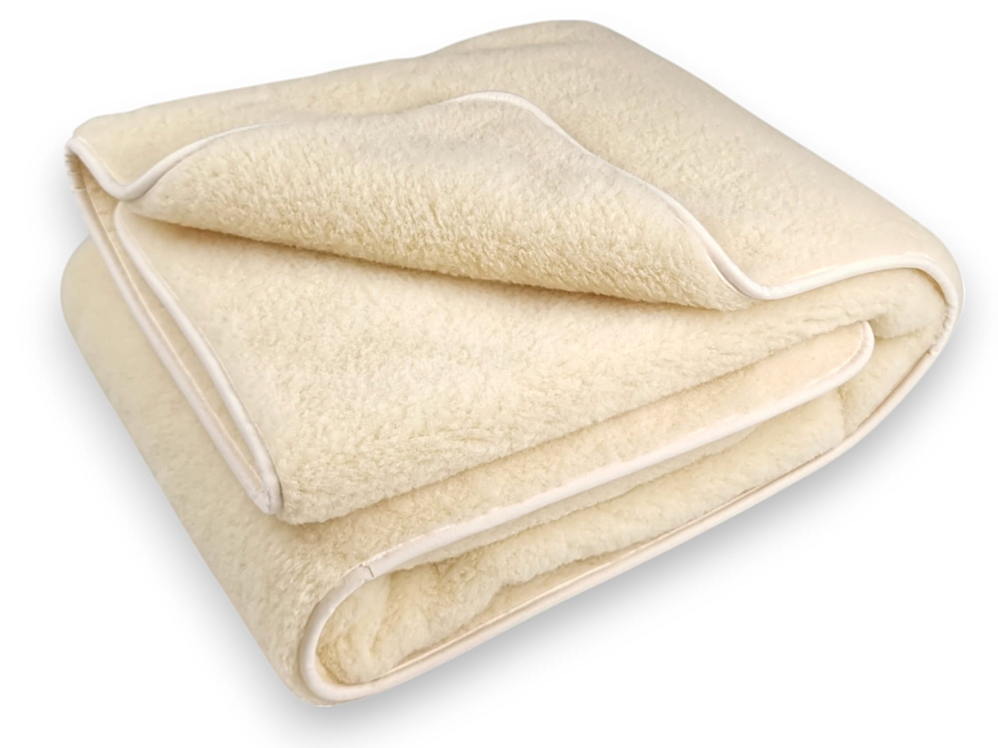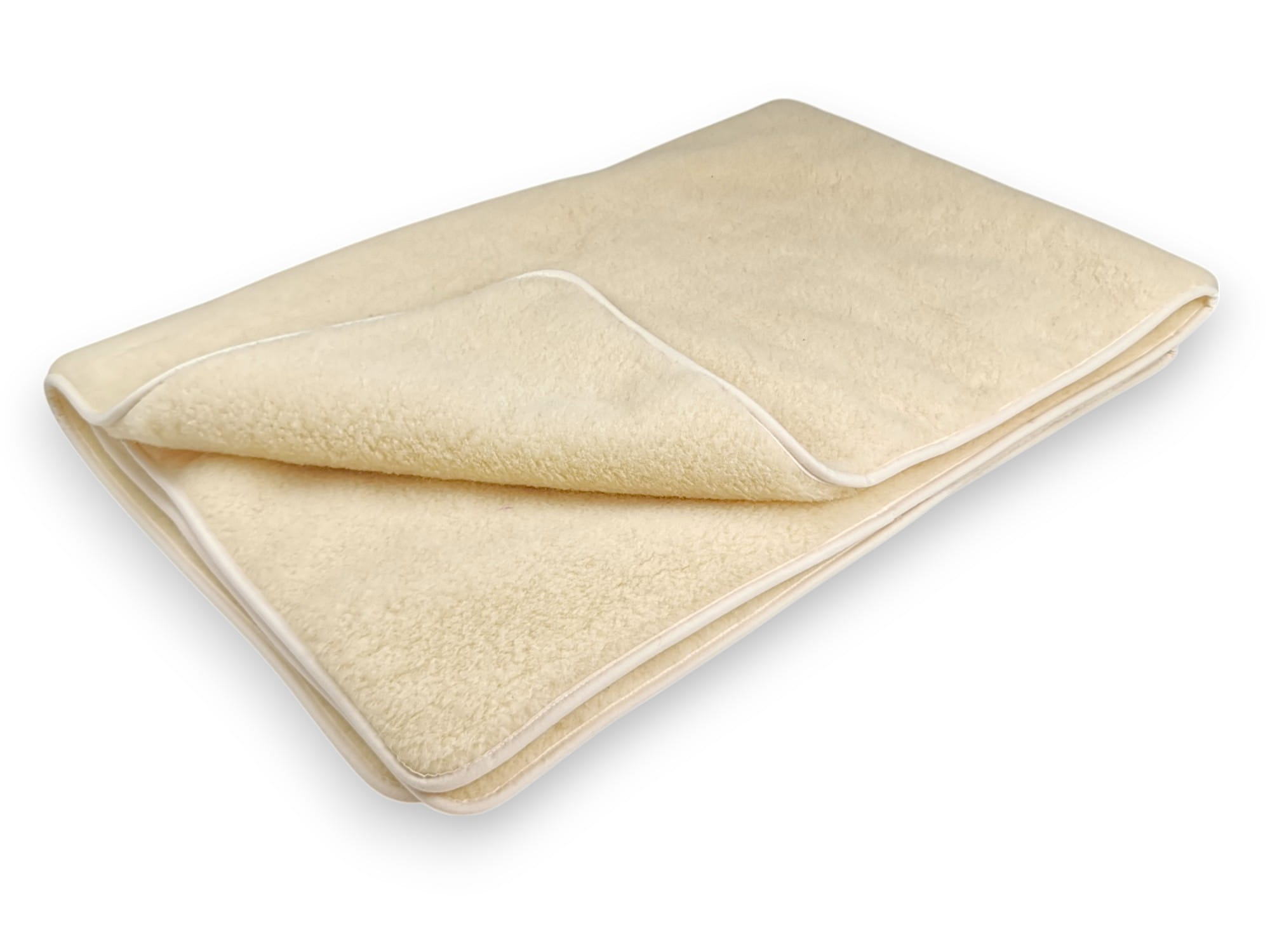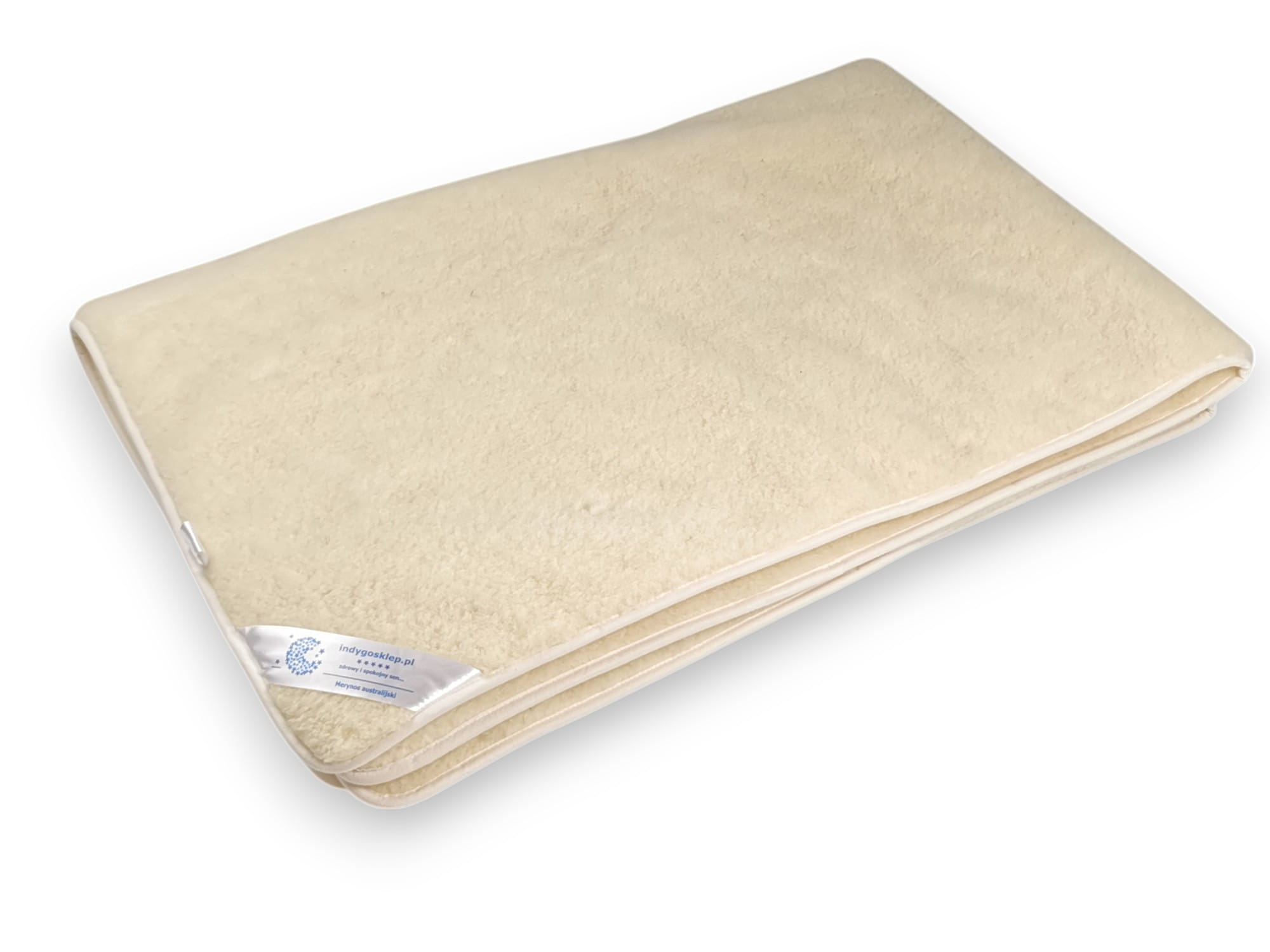 - Elementy pościeli takie jak kołdra i poduszki wykonane są z dwóch warstw dzianiny wełny merynos australijski ecru.