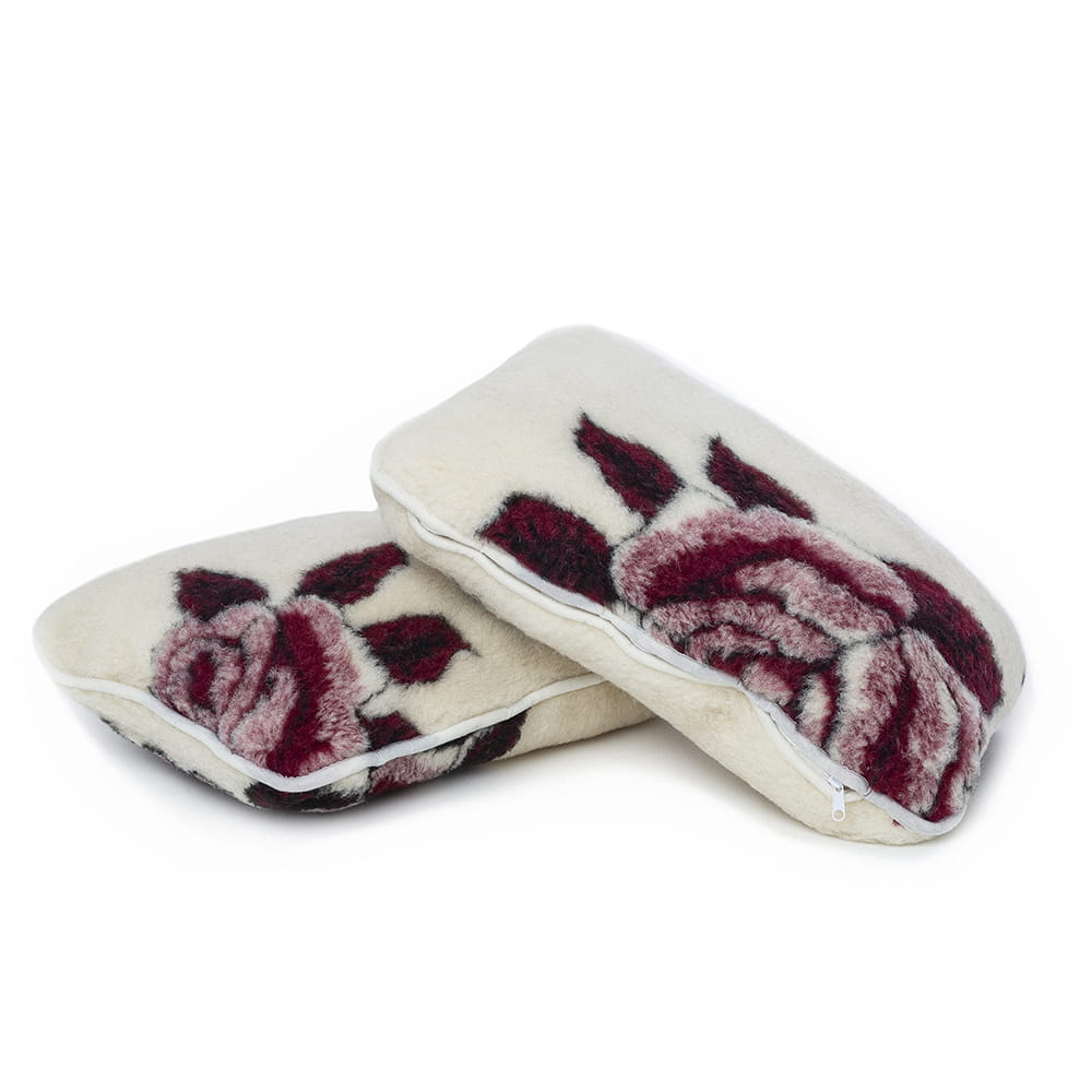 - Elementy pościeli takie jak kołdra i poduszki wykonane są z dwóch warstw dzianiny wełny merynos australijski wzór czerwona róża.