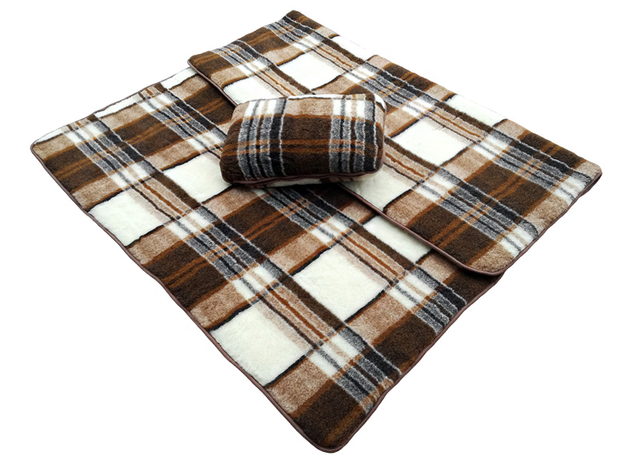 - Elementy pościeli takie jak kołdra i poduszki wykonane są z dwóch warstw dzianiny wełny merynos australijski krata.
