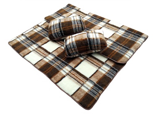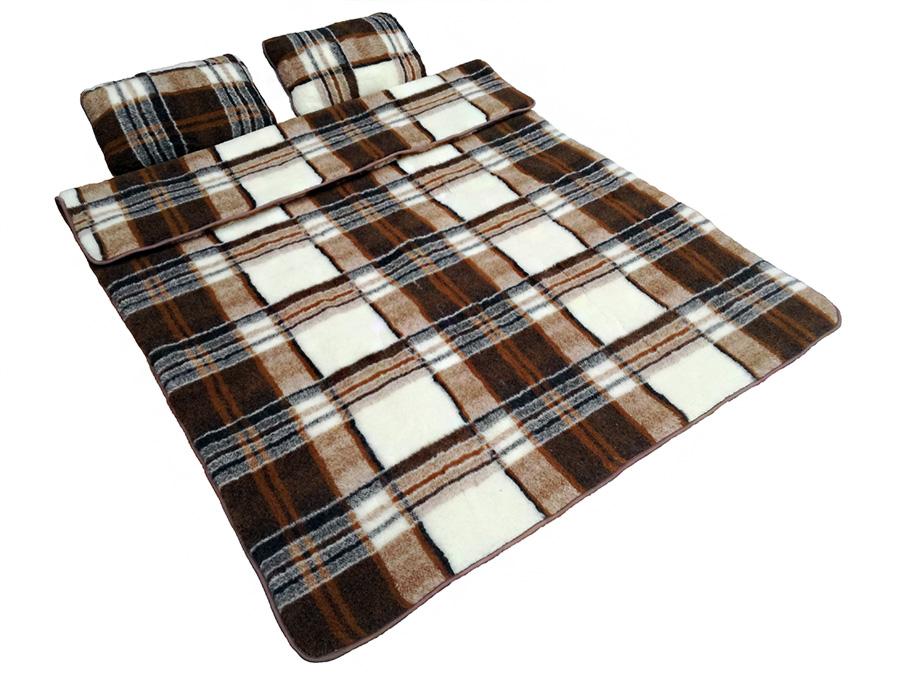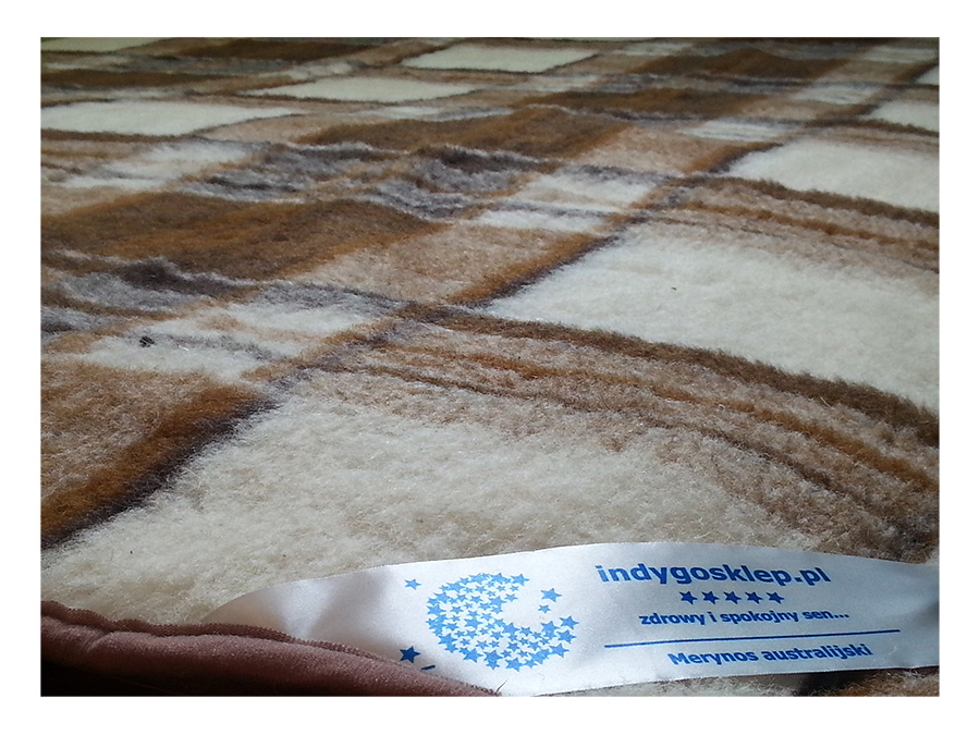 - Elementy pościeli takie jak kołdra i poduszki wykonane są z dwóch warstw dzianiny wełny merynos australijski krata.
