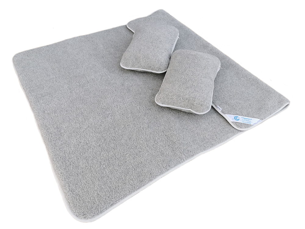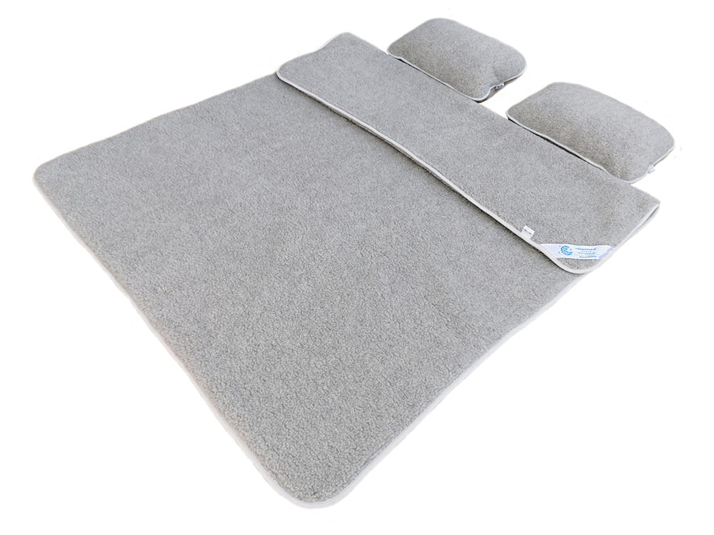 - Elementy pościeli takie jak kołdra i poduszki wykonane są z dwóch warstw dzianiny tumbler szary.